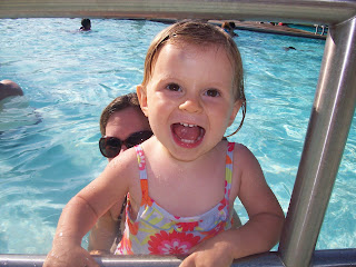 Giving three cheers for her new kitchen set from Grandpa P-M (opened post-bath, if the exposed belly and wet hair didn't tip you off).